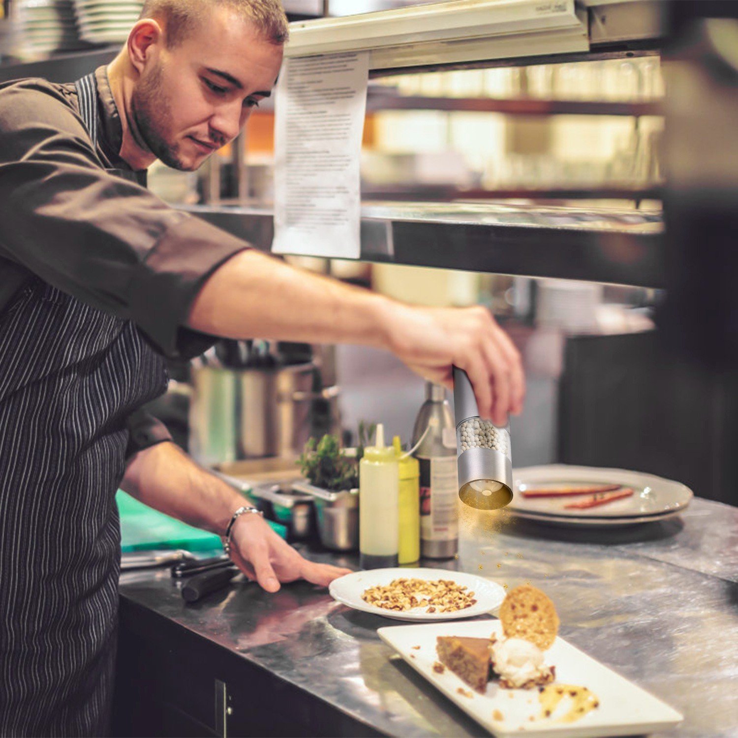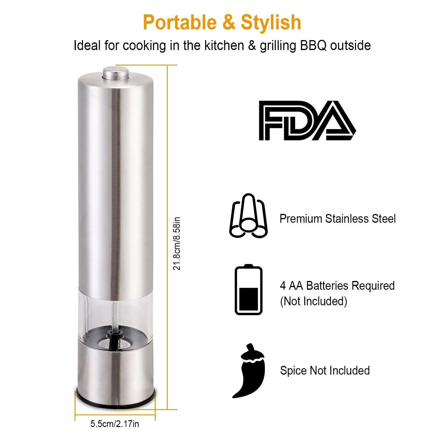 **ELECTRIC PEPPER GRINDER FOR TIME & ENERGY SAVING*:Still manually grind pepper,which waste time and energy? Our electric salt & pepper grinder is battery operated to save your time and energy. Also it's economical and practical,ideal for cooking in the kitchen and grilling BBQ outside and also is a stylish addition to your kitchen and dinner table.