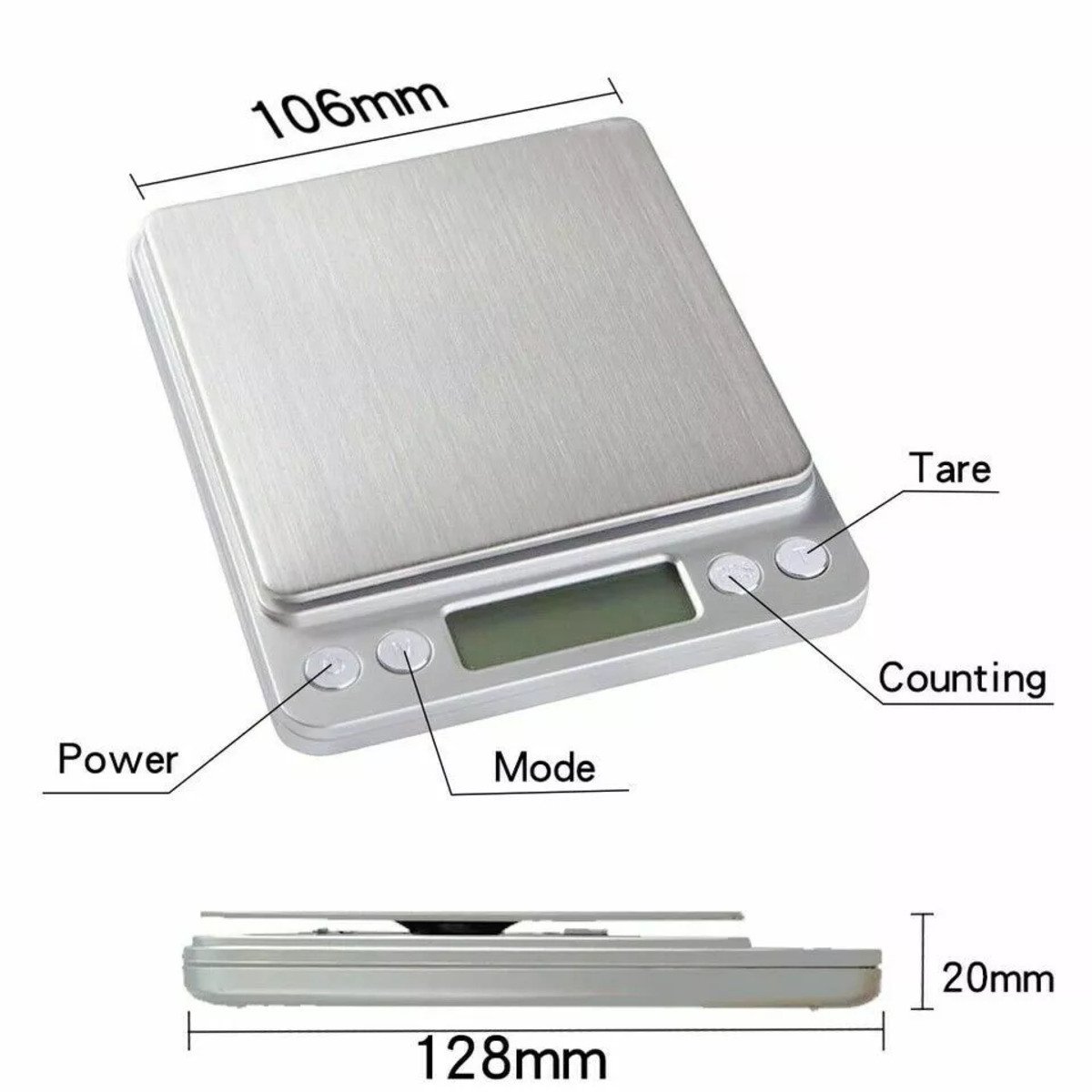 Featuring a clear blue back-lit LCD screen, this digital scale swiftly converts measurement units between g, oz, ozt, dwt, ct, and gn. It includes two trays (13 cm and 10 cm in diameter) that can be used as protectors or additional scale trays, catering to various measuring needs.