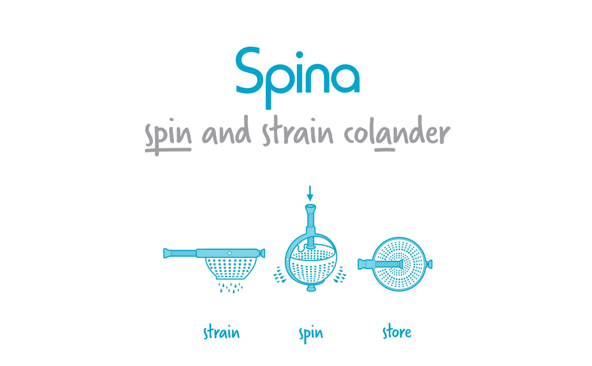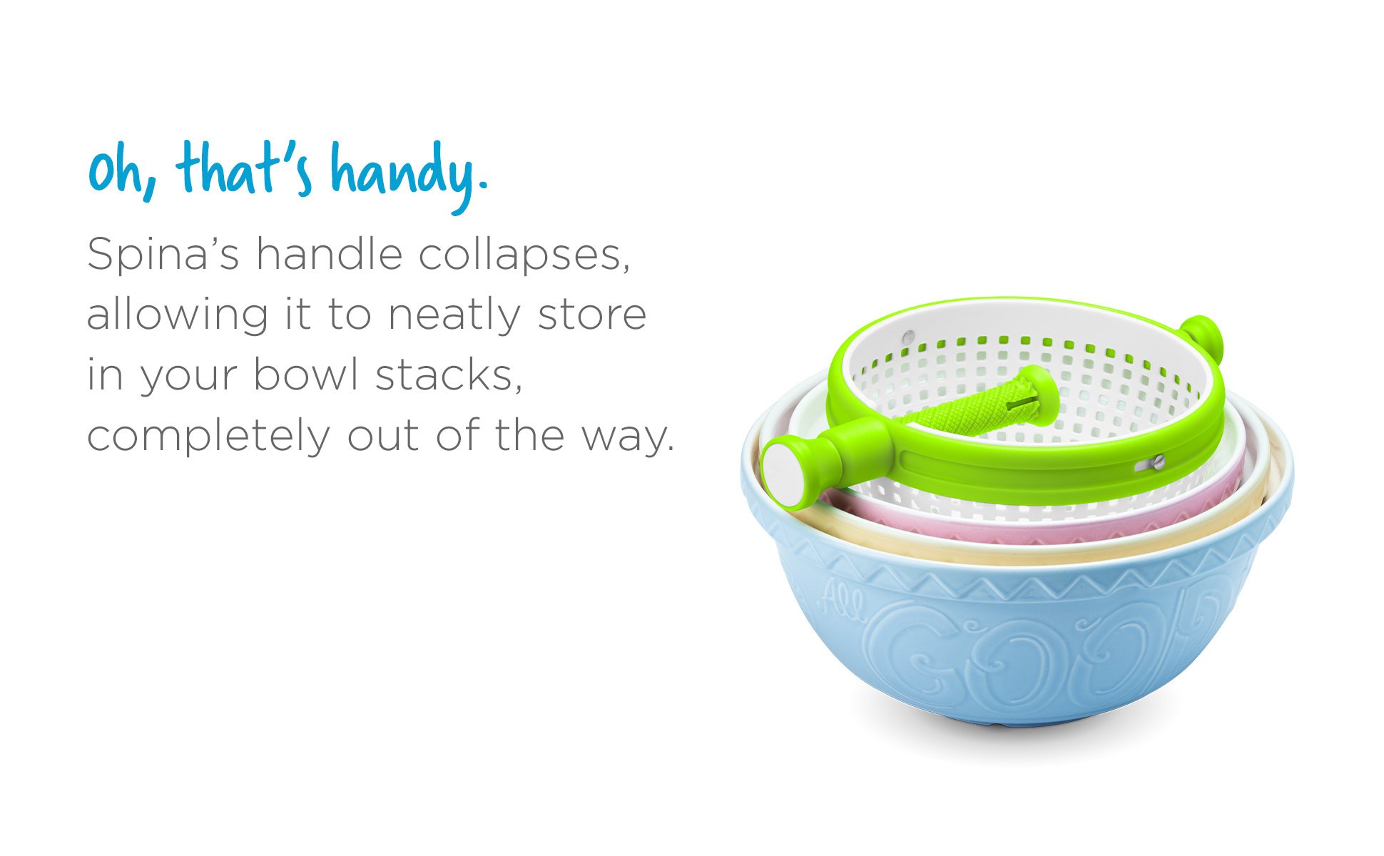 HANDY HANDLE | With space-saving and easy storage in mind, the handle can be pushed inside the colander, allowing it to be stacked in bowls and completely out of the way. Lock the handle to use the Spina as a colander or twist it to create the pump-action spin.